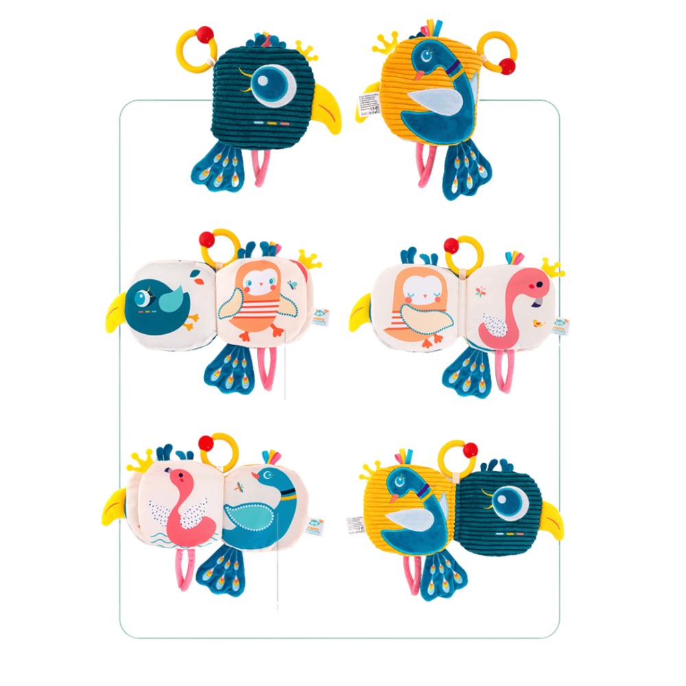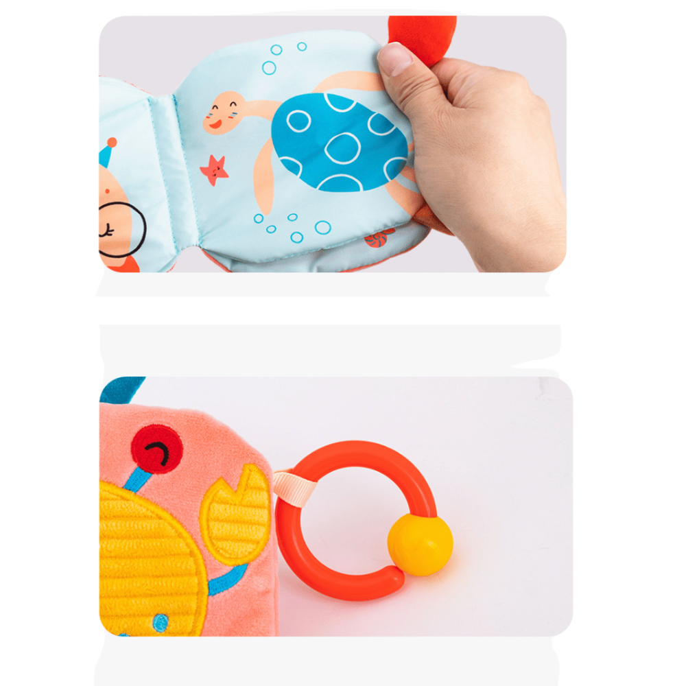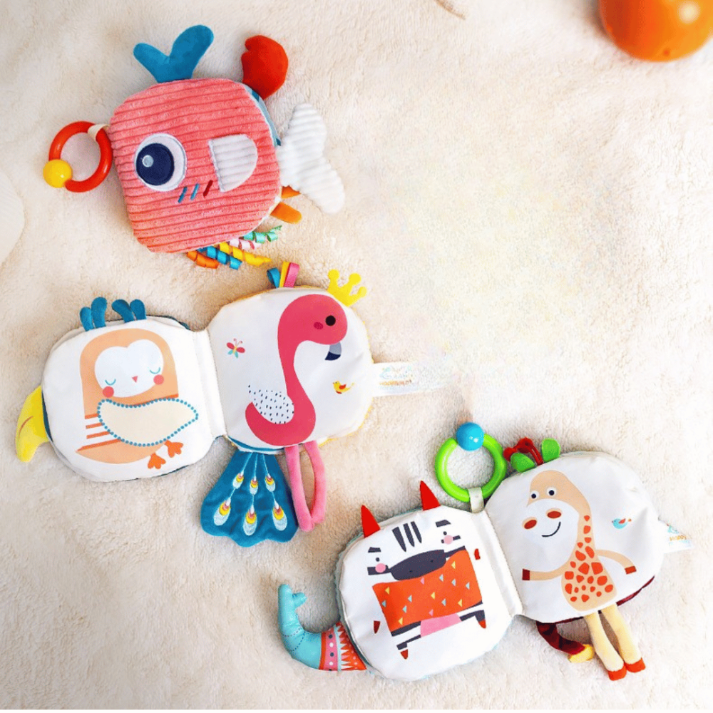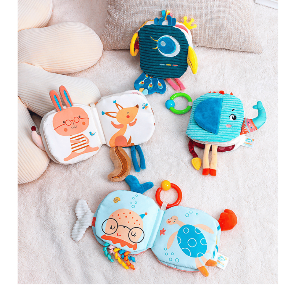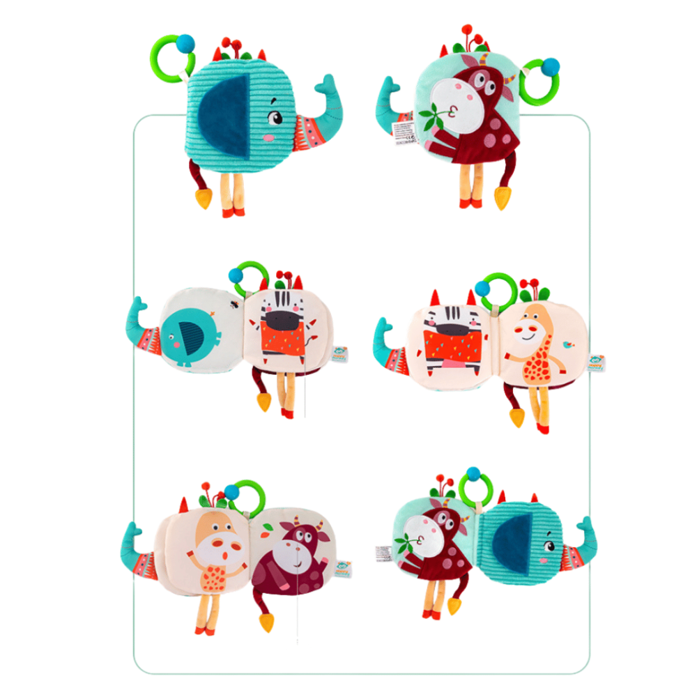 كتاب تفاعلي مصنوع من أقمشة ناعمة وآمنة، بتصاميم حيوانات مرحة وألوان زاهية تشجع الطفل على الاستكشاف وتنمية حواسه.